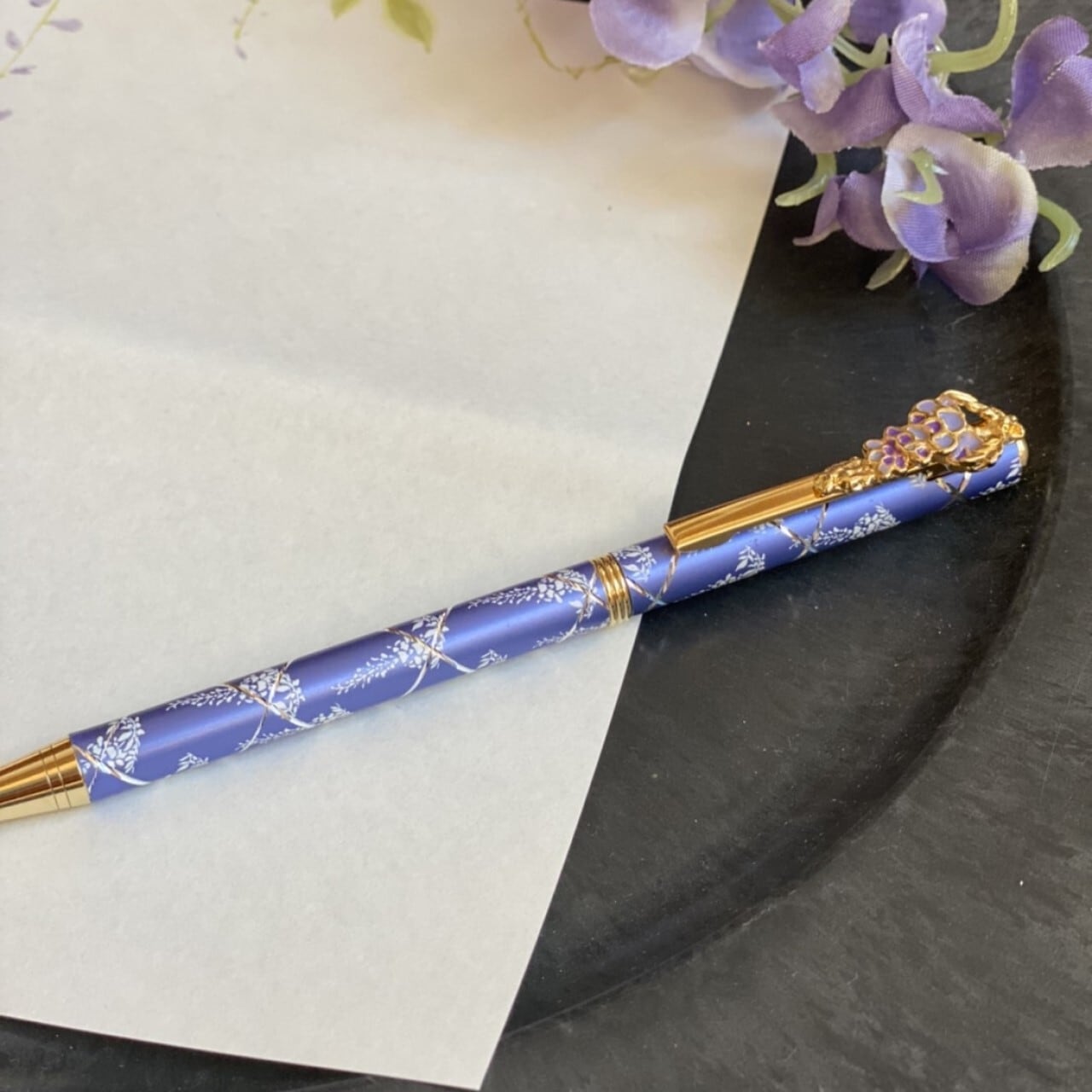 パープルとゴールドをベースとして本体部分に藤をデザインしたボールペンです。